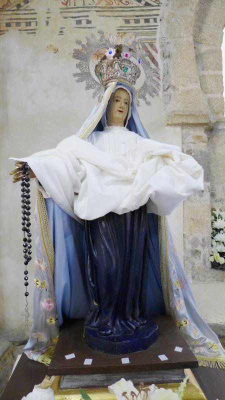 Imagen de bulto de factura popular que se muestra totalmente vestida con ropajes de moderna factura, Se dispone de pie, sobre peana solidaria, su brazo derecho extendido, cuya mano sostiene moderno rosario, y brazo izquierdo con el que sujeta a un Niño posterior. Viste manto, repintado toscamente de azul, repolicromía que afecta al calzado que asoma por debajo.