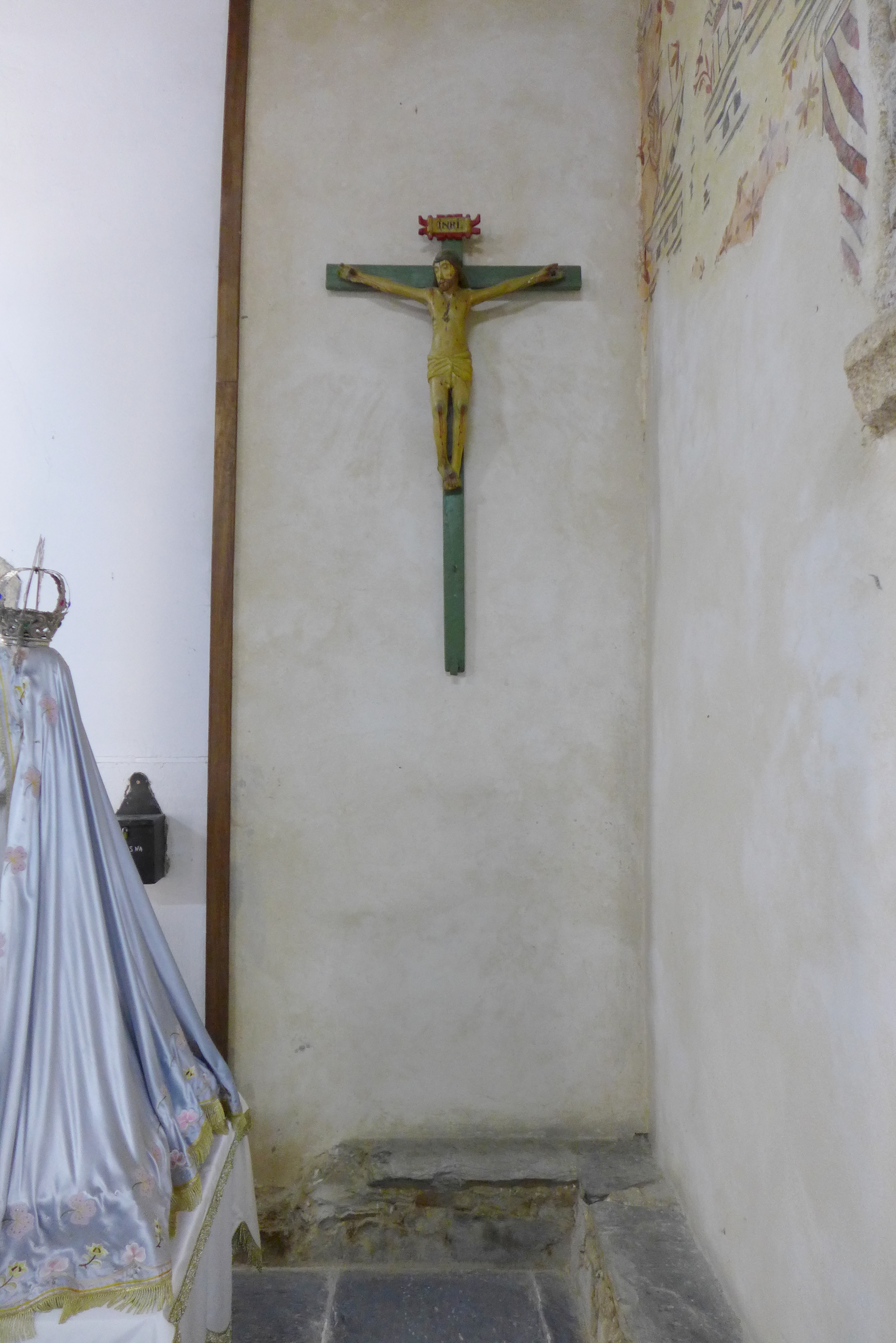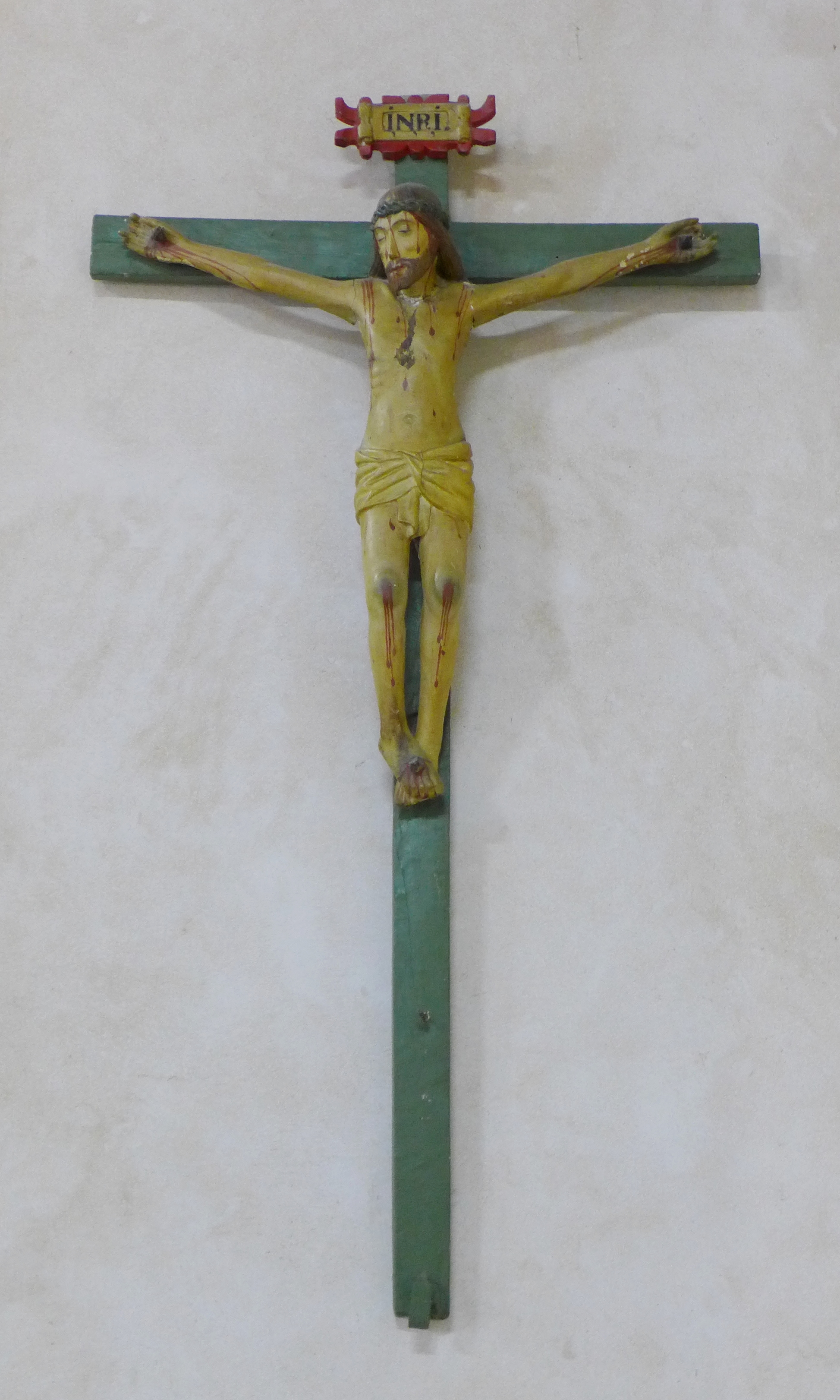 Cristo crucificado de factura con buscados arcaísmos, que cierra sus sorprendentes ojos rasgados. Su estudio anatómico es sumamente esquemático, con brazos en moderada forma de "v". El paño de pureza se pliega en su parte central. La corona de espinas es de talla, pero apenas resalta.