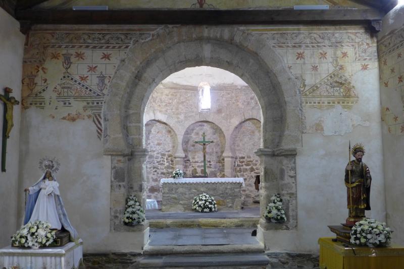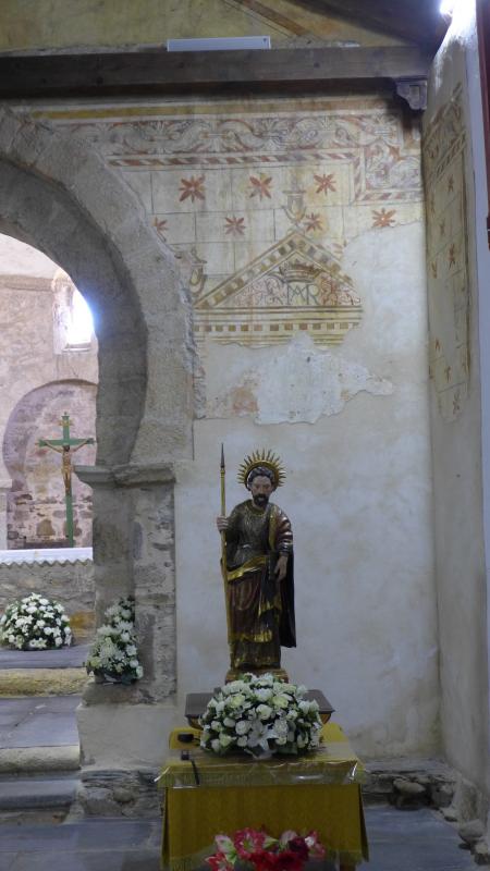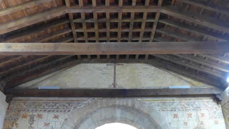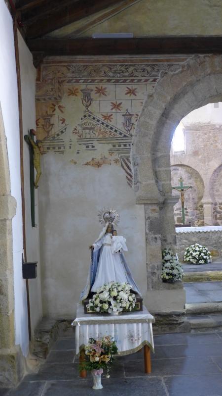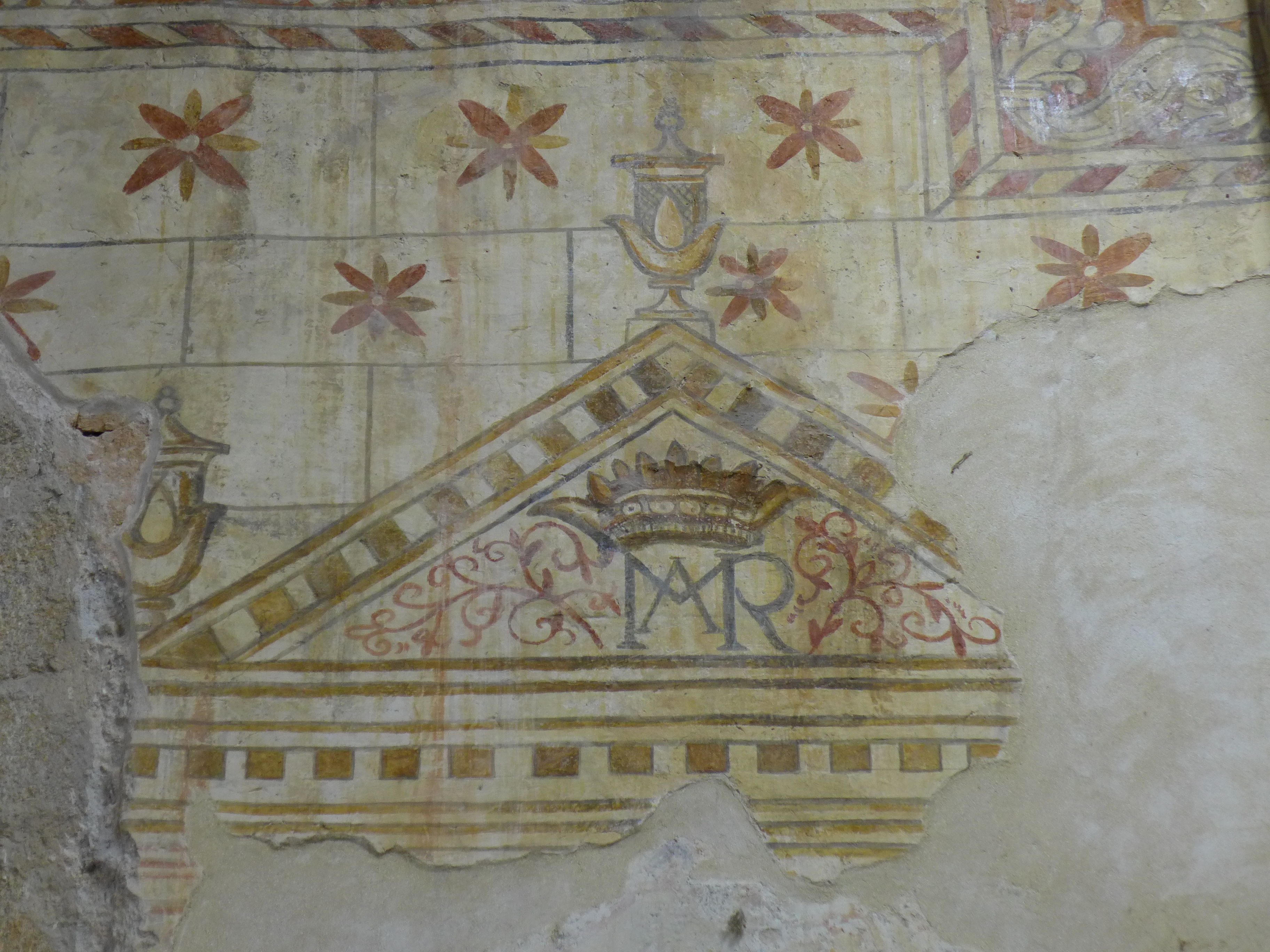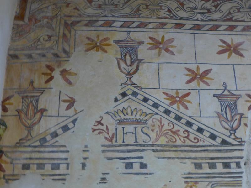 Esta pintura mural debió de extenderse por buena parte de la nave del templo, pero hoy se ciñe casi en exclusiva al muro de conexión con la cabecera, a ambos lados del arco de Gloria. Perdida en su mitad inferior, el resto describe una suerte de despiece de sillería con estrellas en su interior, una cenefa superior (de cierre) a base cintas y vegetales anillados y dos retablos fingidos en los extremos, que se debieron de articular a base de columnas tornas, un tímpano triangular con tres jarrones como remate. Las inscripciones de sus tímpanos parecen indicar que uno estaba dedicado a la Virgen (MAR) y otro a Cristo (IHS). Su gama de colores se limita al rojo, azul y ocre.