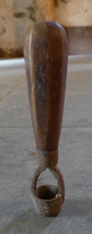 Herramienta compuesta de mango de madera y cabeza de forma con un aro adecuado para recortar hostias de tamaño pequeño.