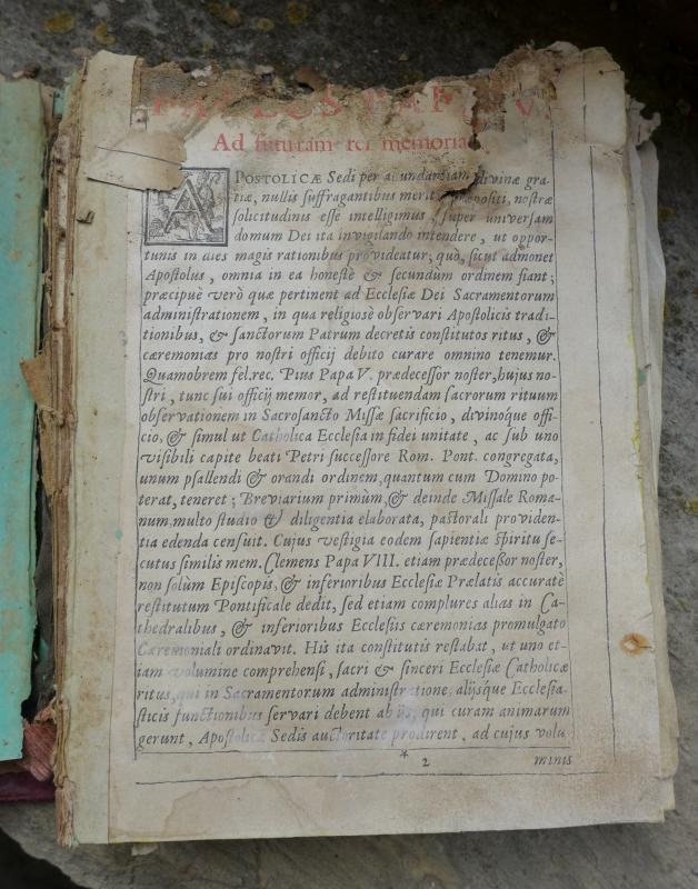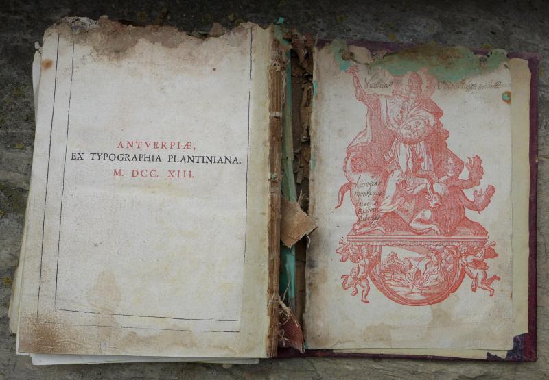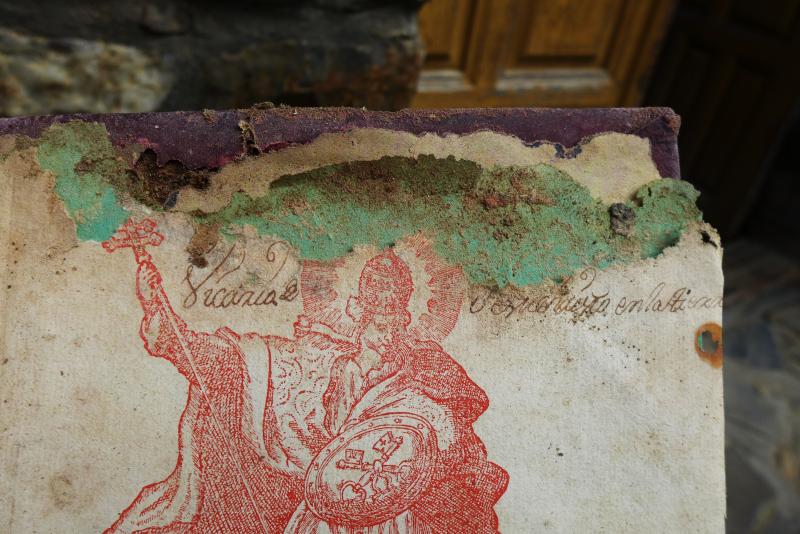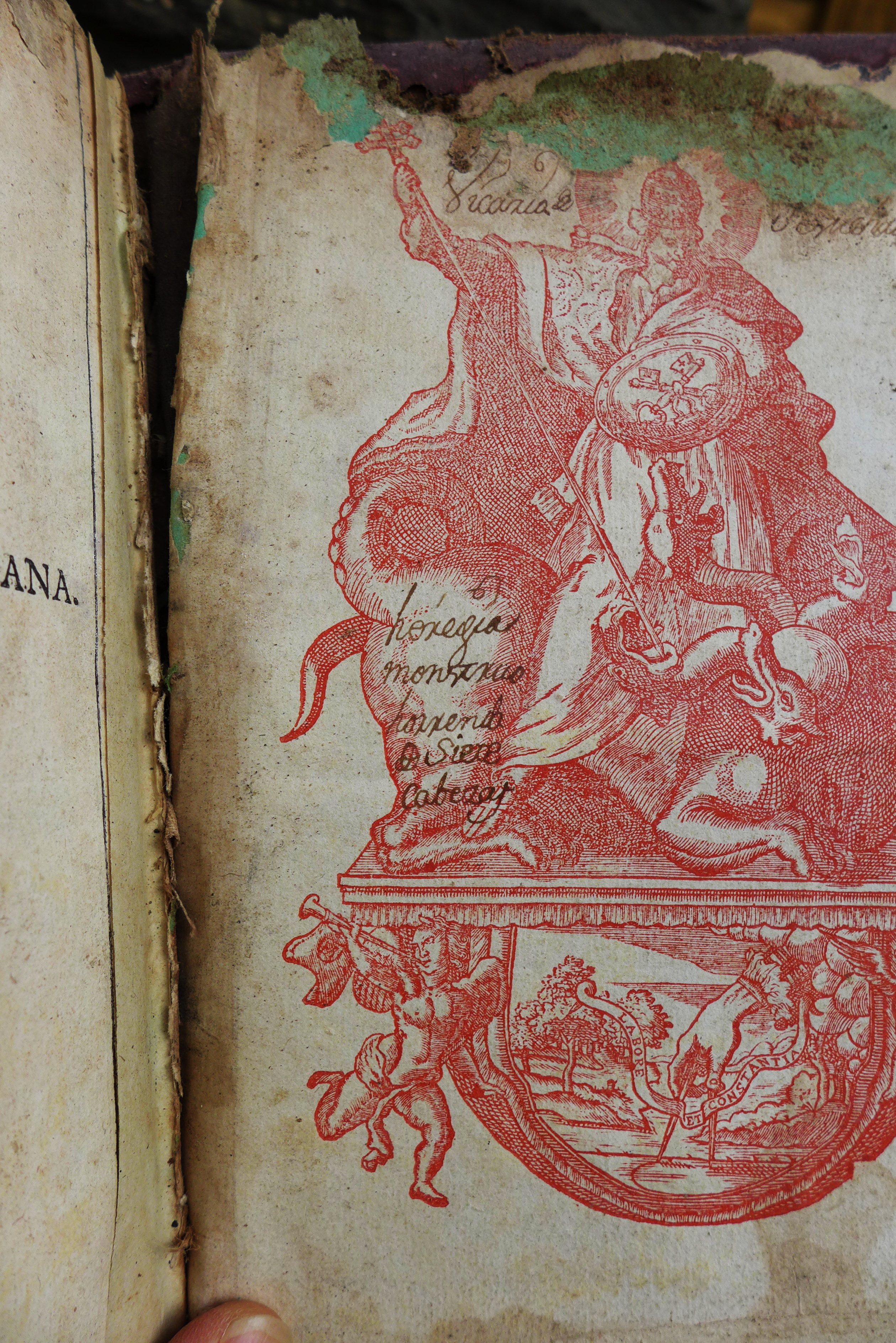 Conserva dos inscripciones manuscrita en la página final, sobre un grabado de color rojo.