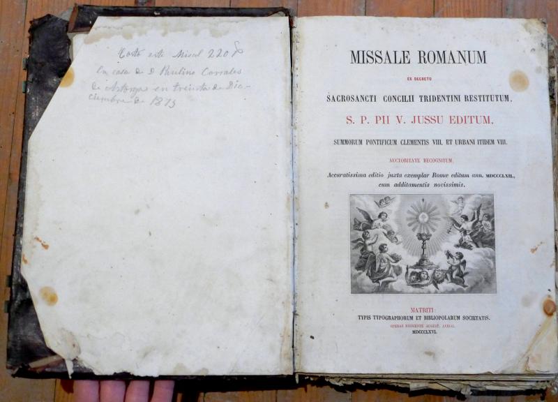 Conserva una inscripción en la página de respeto: "Costó este misal 220 reales / en casa de D. Paulino Corrales / de Astorga en 30 de dic- (sic) / ciembre de 1875".