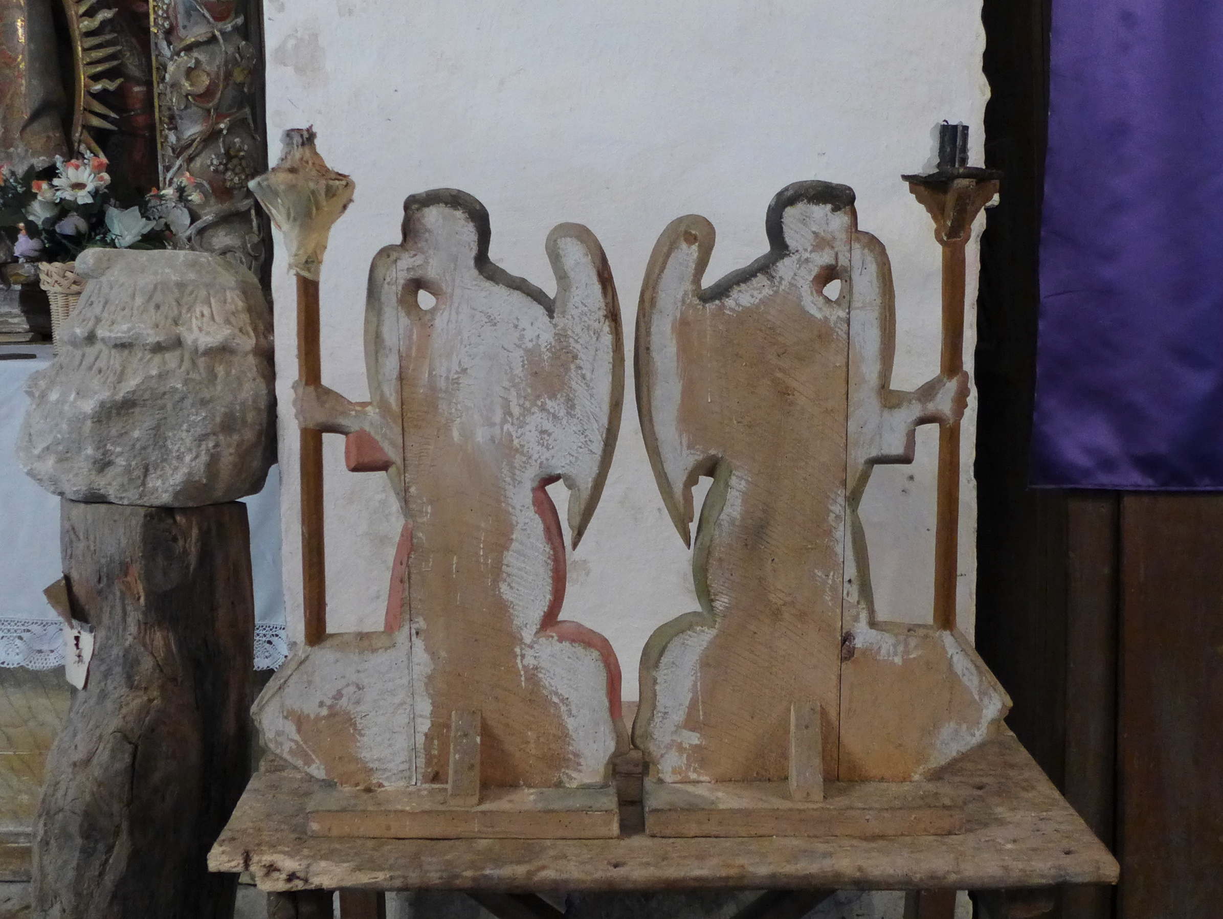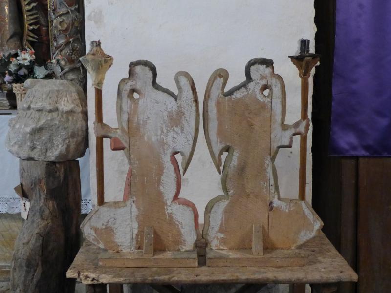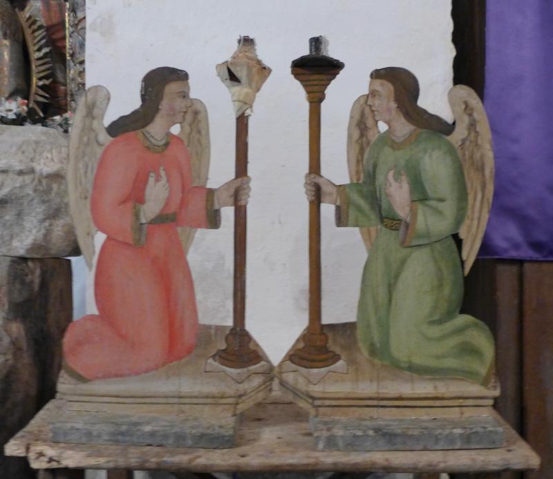 Piezas de madera efigiando a dos ángeles ceroferarios afrontados y de rodillas sobre sendas peanas molduradas. Visten larga túnica hasta los pies de colores rojijo y verdoso. Sus largas caballeras son de color castaño y las alas marrones. sus manos se unen en el pecho, Una mano sustenta un largo hachero y la otra se apoya en el pecho. Pudieron formar parte de un monumento de Jueves Santo, aunque hoy se conservan aislados.
