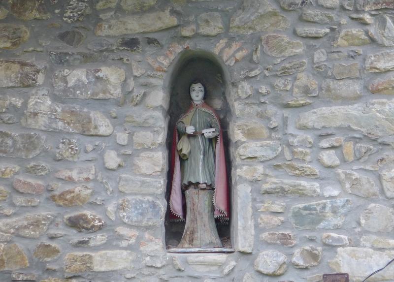 Imagen en bulto sobre una altísima peana (un tocón sin desbastar) que muestra a un niño de pie, frontal e inexpresivo, que sostiene lo que parece un libro en su mano izquierda (lo que lo identificaría con san Justo), y un atributo perdido en la derecha.