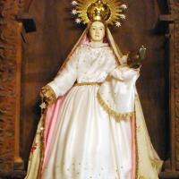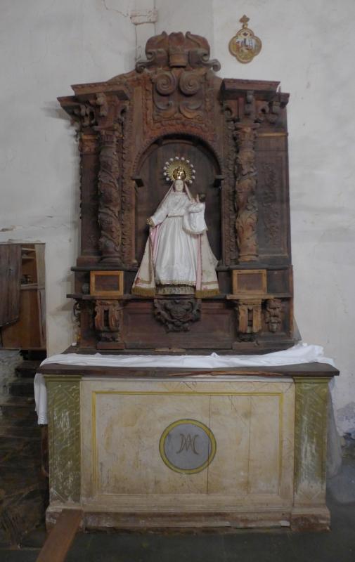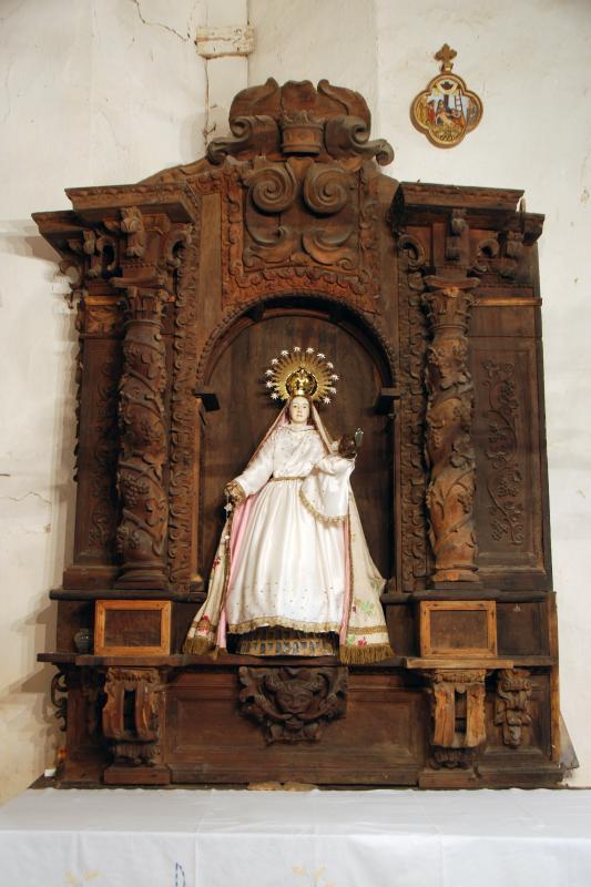 Abre una gran hornacina central (para acoger a la única imagen, la Virgen del Rosario) entre dos columnas salomónicas decoradas en su fuste con racimos de uvas, apoyadas en netos a los que se han superpuesto marcos de madera, y con capiteles corintios. En los extremos laterales sendos paneles decorados en relieve con más racimos de uvas y jojas de vid.