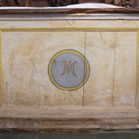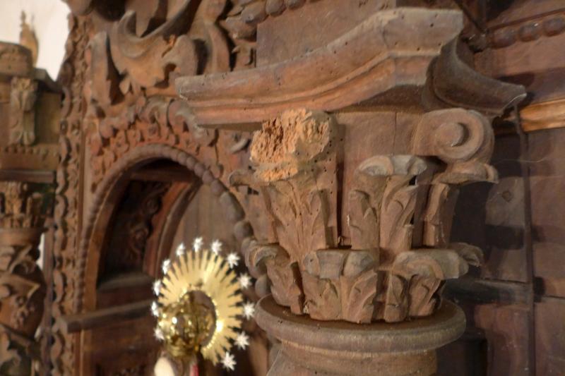 Hay reposiciones inadecuadas de piezas (como los marcos de los netos de las columnas) y pérdida de material en algunas partes del retablo, como en las ménsulas que sujetan las columnas o en algún capitel.