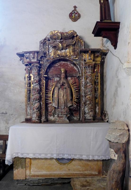 Abre una gran hornacina central (para acoger a la única imagen, la Inmaculada) entre dos columnas salomónicas decoradas en su fuste con racimos de uvas y hojas de parra, con capiteles corintios. Los laterales están enmarcados por sendas pilastrillas con decoración floral. Carece de predela.