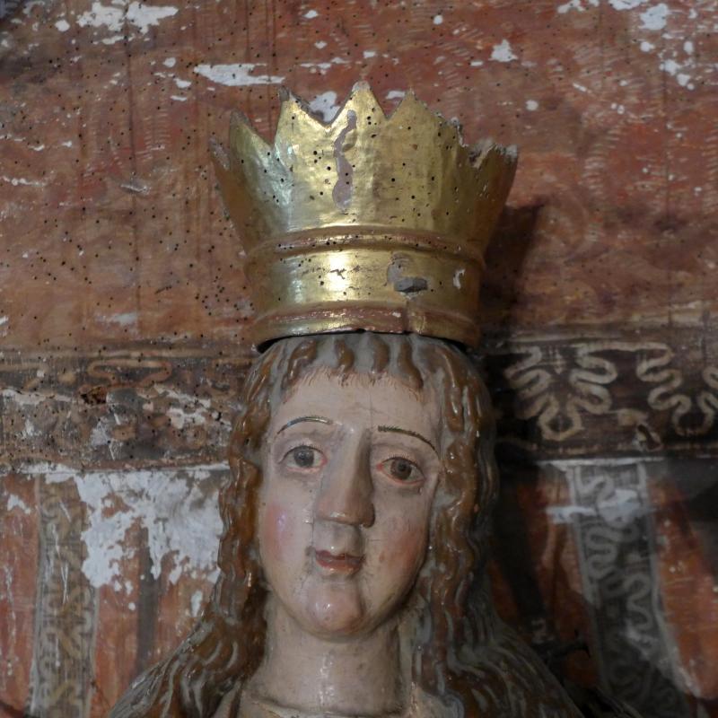 La gran corona, de talla y dorada, parece posterior, seguramente confeccionada entre los siglos XVIII-XIX.