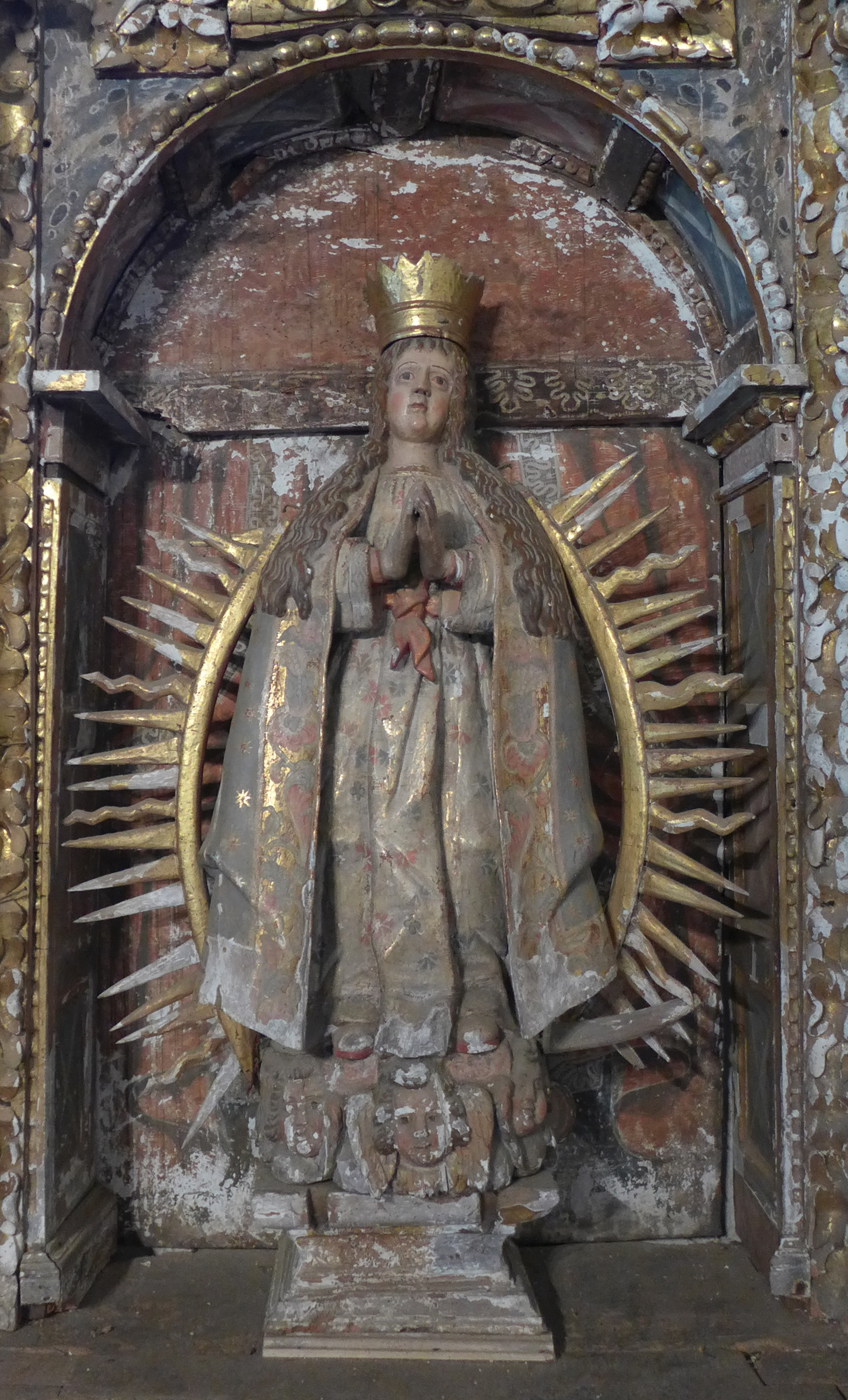 Imagen de la Virgen de pie, en actitud orante, enmarcada por una mandorla radiada. Se apoya en una doble peana, la inferior añadida, y la superior, tallada y solidaria con la pieza, decorada con cabecitas aladas.