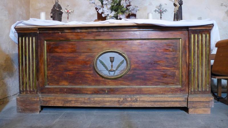 Mesa de altar compuesta de un tablero moldurado que se retranquea entre dos pilastras acanaladas. Su mínimo entablamento soporta el tablero de la mesa.