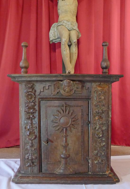 Sencillo tabernáculo exento, de planta rectangular. Consta de una puerta flanqueada por un ancho marco de madera con decoración en relieve, vegetal en las laterales, y con dentellones y la cabeza alada de un ángel en la superior.