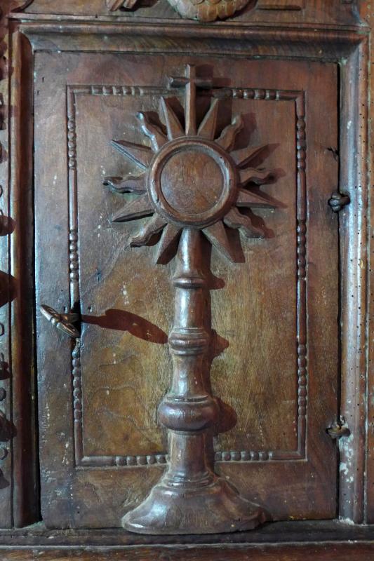 Puerta con un un listel perimetral con contarios y partes lisas sobrel que se ha tallado en relieve una gran custodia, de pie abalaustrado y viril radiado, con potencias que alternan las rectas y las flamígeras.