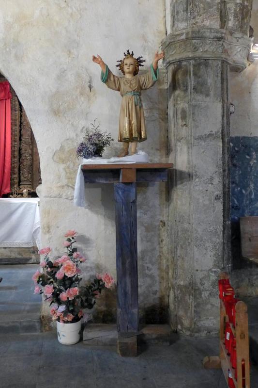 Sencilla peana compuesta de pie, un maderao con aristas rebajadas, y una bandeja para sostener una imagen, en este caso un Niño Jesús de escayola,