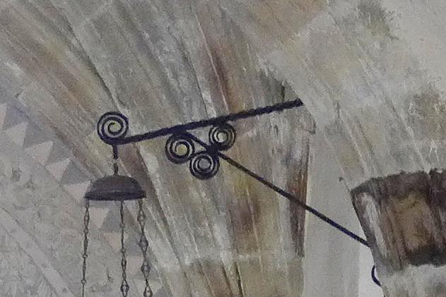 Pescante de obra de forja compuesto de dos barras de hierro torsas rematadas en volutas de varias vueltas, imitando las S de la forja románica. Carece de garrucha, por lo que no puede subirse y bajarse, como suele ser habitual.