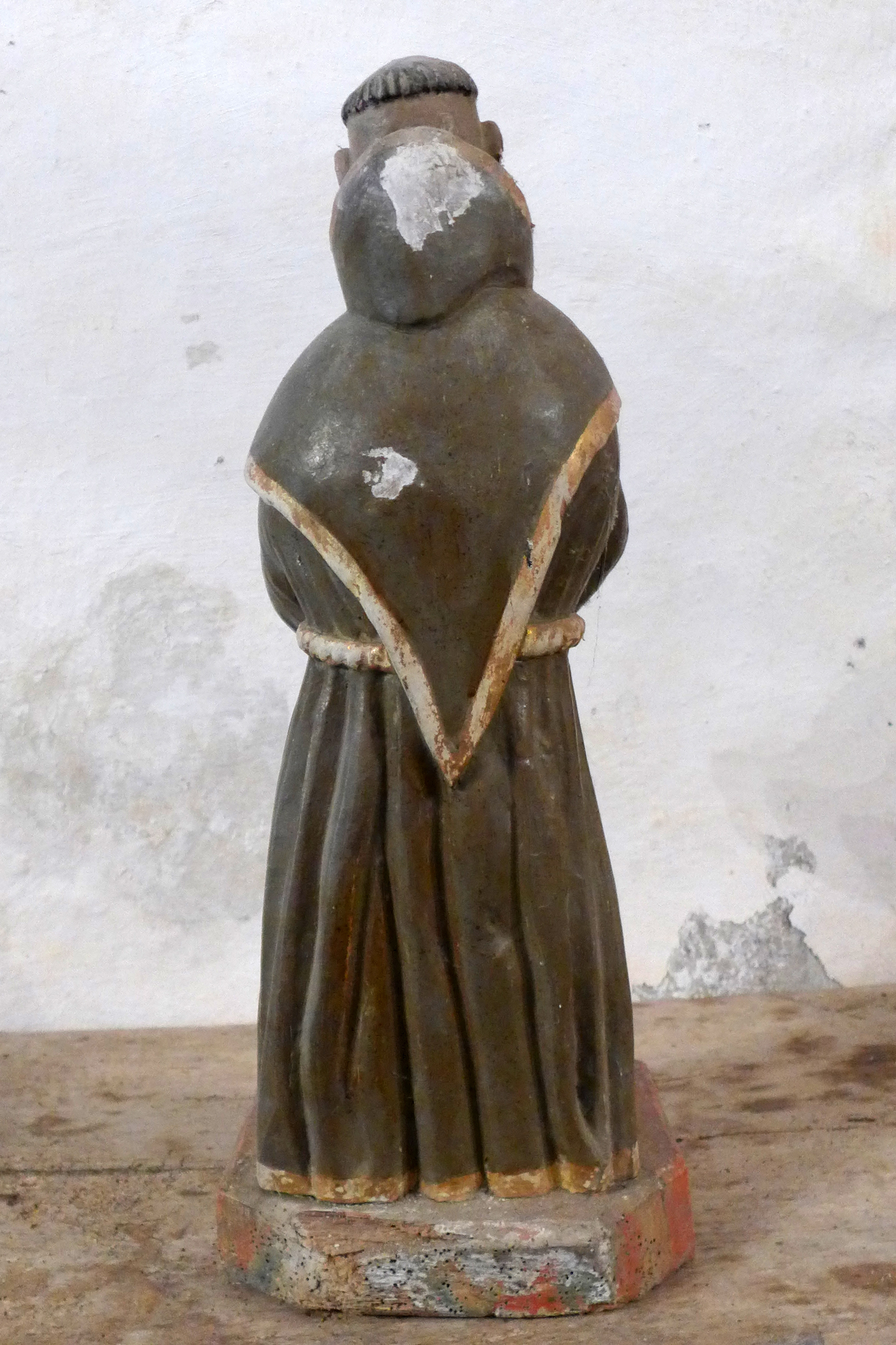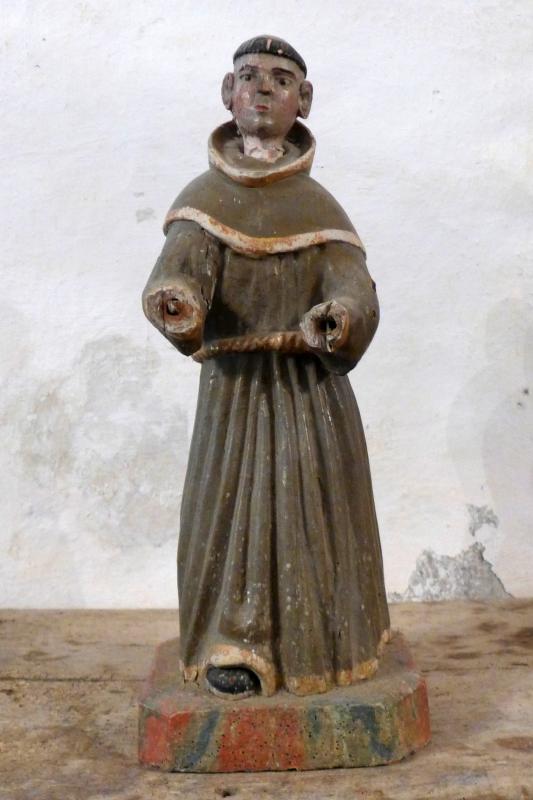 Santo de pie, con el paso avanzado, y manos extendidas donde sostendría al Niño que habría de acompañarle. Tonsurado, viste el hábito franciscano, con ribetes que imitan dorados, y cíngulo que lo ciñe. El tratamiento de los plegados, así como el cuello de la cogulla muestran las limitaciones del artista, apegado a moldes y técnica muy populares.