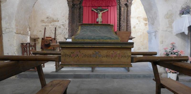 Andas procesionales para llevar seguramente la imagen de la Virgen del Rosario. Se compone de un cuerpo cuadrangular pintado delicadamente en sus laterales con elementos florales. Encima se dispone la peana, troncocónica y jaspeada.