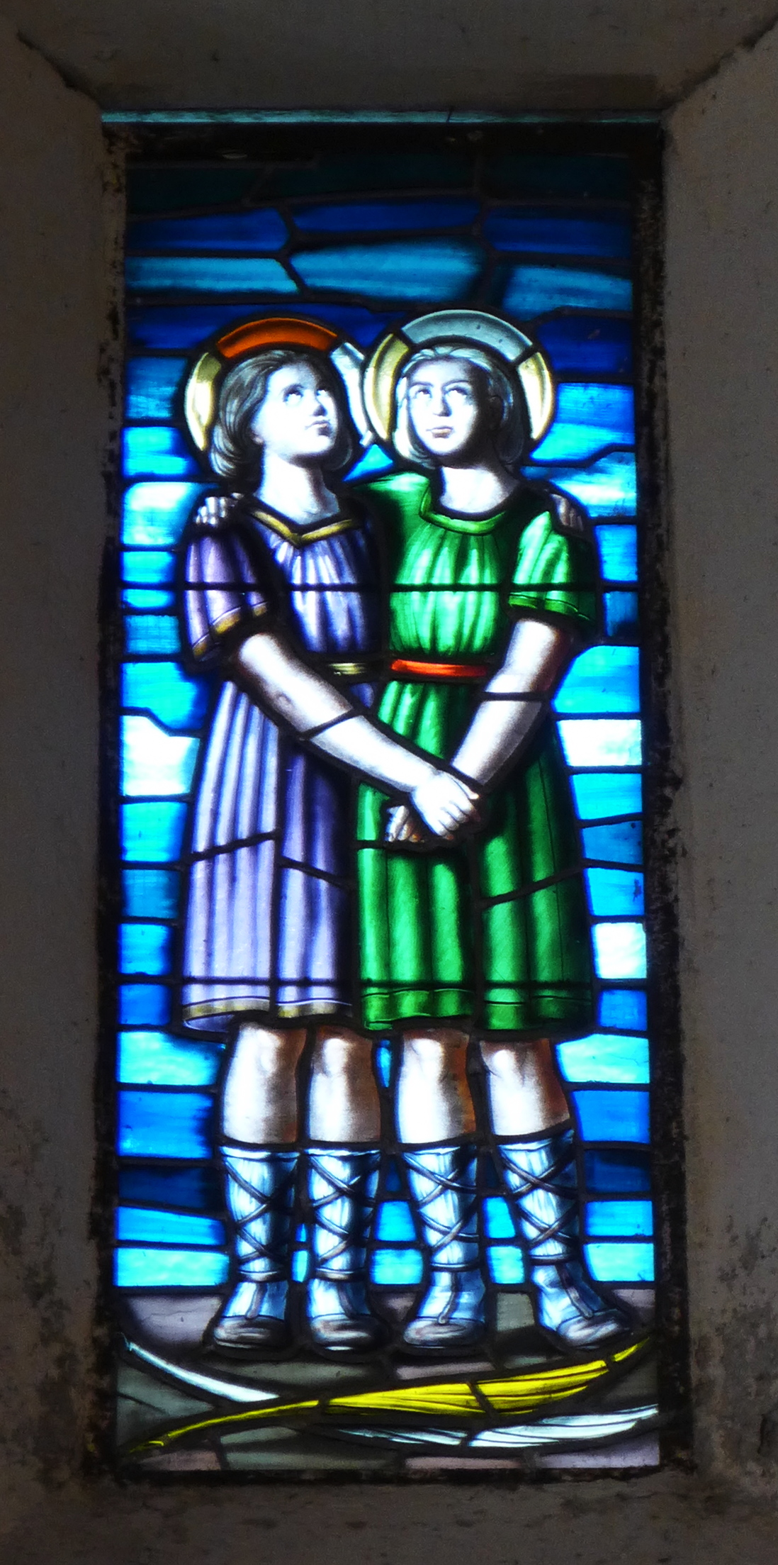 Representa a los santos niños, de pie, nimbados y abrazados. Visten a la romana y tienen las palmas de martirio en el suelo.
