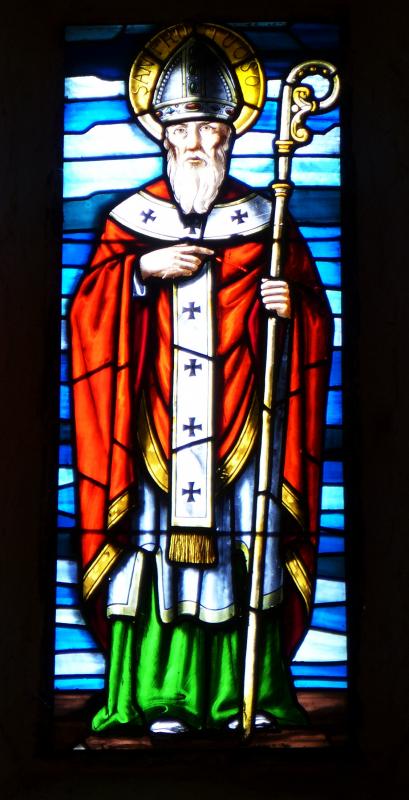 Vidriera en sentido vertical, emplomada y sujeta por dos pletinas horizontales de hierro.
