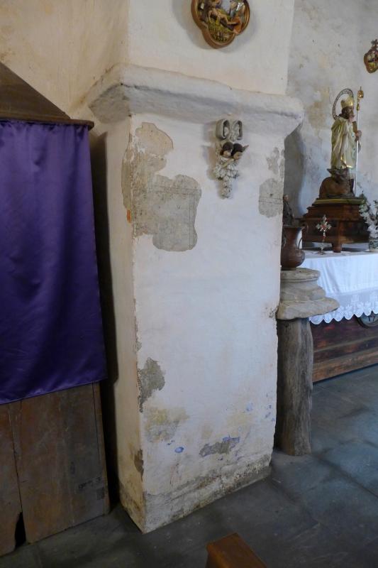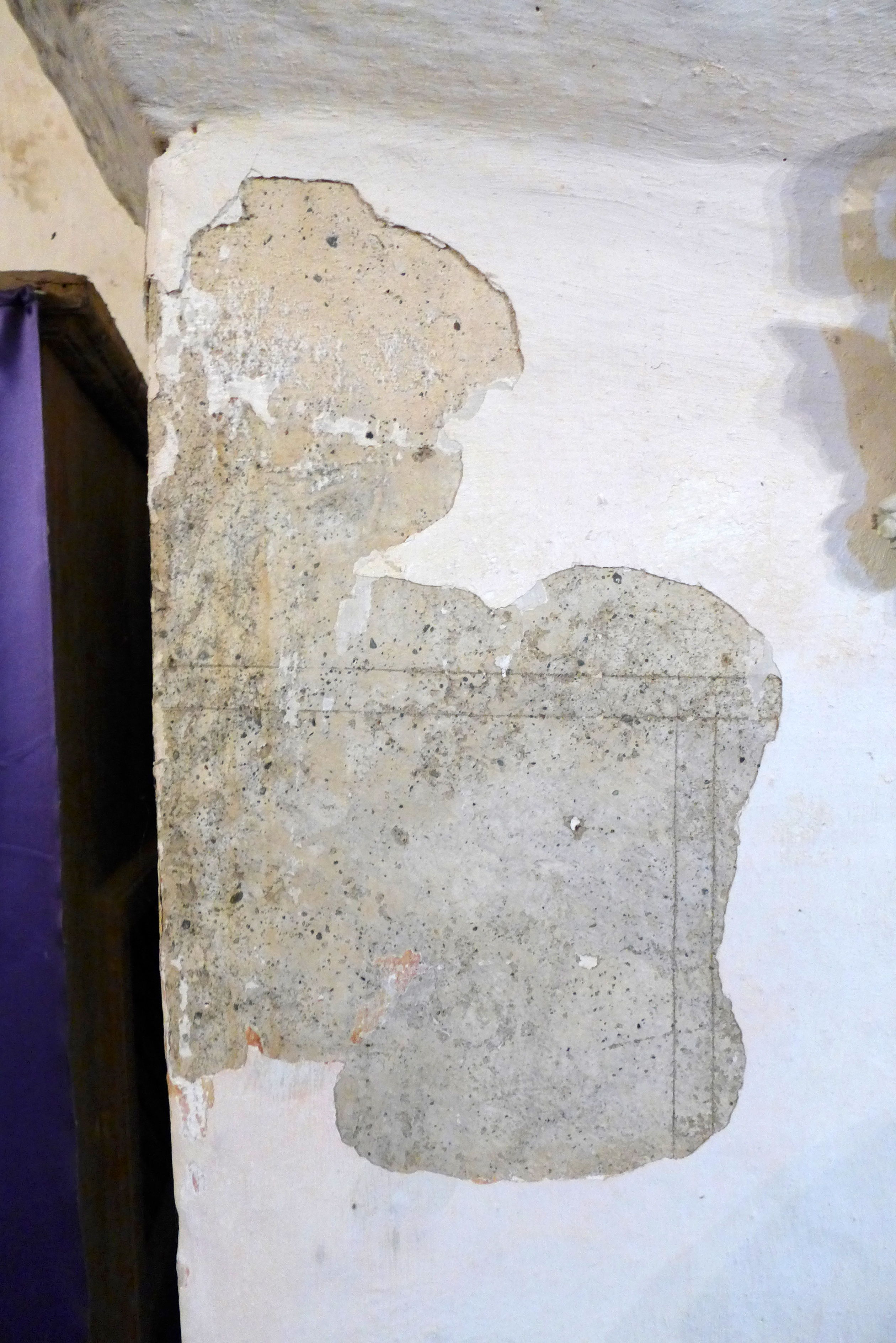 Fingido inciso de sillares dispuesto bajo varias capas de enlucidos más recientes.