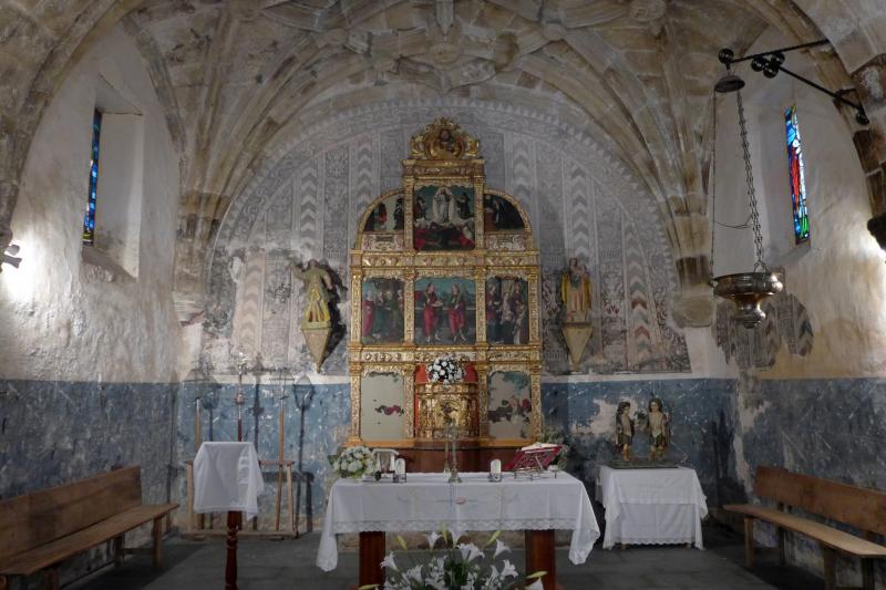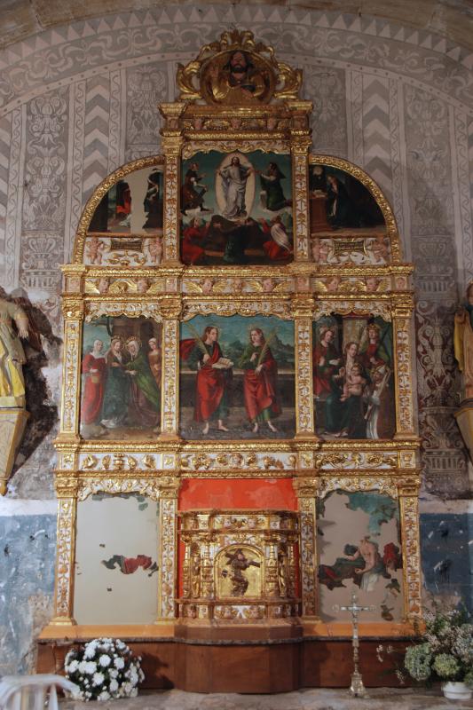 Retablo de tablas pintadas (seis) estructurado en tres cuerpos y otras tantas calles, rematado por un ático con un relieve. Ha perdido la predela que hubiera de tener.