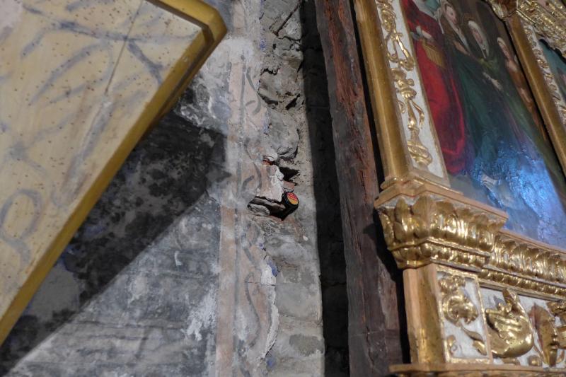 La mazonería del retablo consiste en pilastrillas y entablamentos con fondos policromados en blanco y decoración dorada en relieve (cabecitas aladas, bustos, grutescos, cueros recortados y otros motivos seriados renacientes).