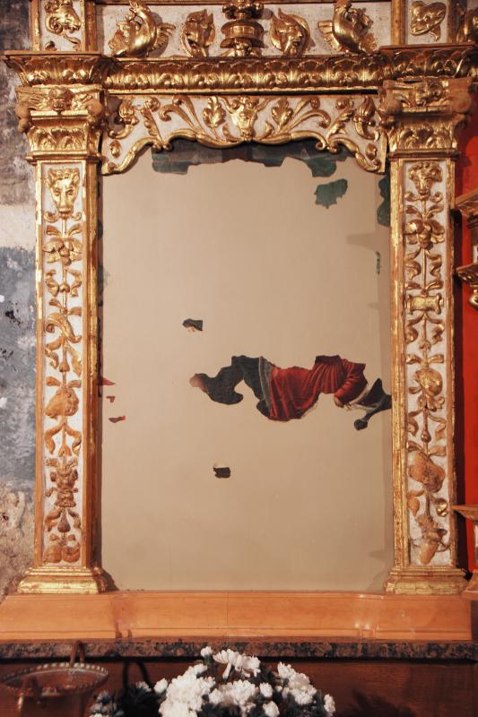 Los mínimos fragmentos de soporte conservados impiden la descripción. Apenas se ha conservado un detalle de un vestido rojo y del cielo de fondo.