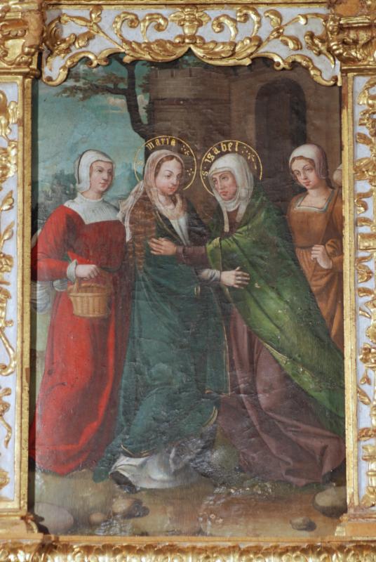 Identificadas por cartelas inscritas en sus nimbos dorados, ocupan el centro de la escena María (vestido blanco y manto azul) y su prima Isabel, que se están abrazando. La primera deja ver una larguísima cabellera por debajo de su toca, que en el caso de Isabel le cubre todo el pelo, acorde cada una a su condición y edad. Asisten a la escena otras dos mujeres, en segundo plano pero ofreciendo una composición simétrica. El fondo es arquitectónico, y se adivina detrás de ellas la entrada de un castillo.