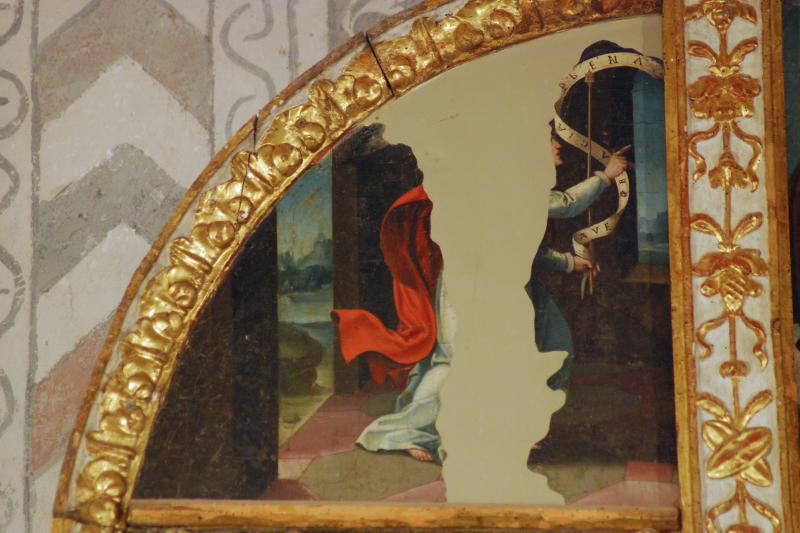 Este se sitúa en un interior, y tan solo se ha conservado parte del manto rojo y del vestido blanco, así como la filacteria al viento que sostiene con sus manos, donde se inscribe el saludo angélico: "AVE GRACIA PLENA" y un cetro.