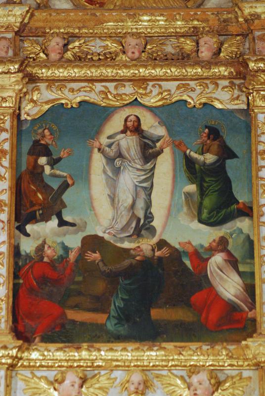 Arriba, Cristo en mandorla, de pie, frontal. El color claro de la mandorla, y el blanco de vestido y manto, con buen tratamiento de pliegues, lo hacen el eje de la composición. Le flanquean Moisés (a la izquierda, con cuernos y las tablas) y san Elías, (derecha), diferenciados por el distinto color de sus ropajes. Ambos flotan de modo artificial sobre sendas nubes.