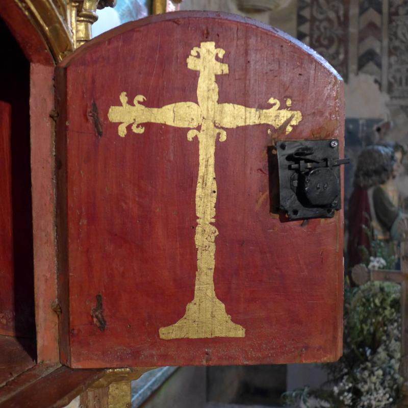 En la cara interior de la puerta se esgrafió una cruz dorada de brazos abalaustrados y remates flordelisados