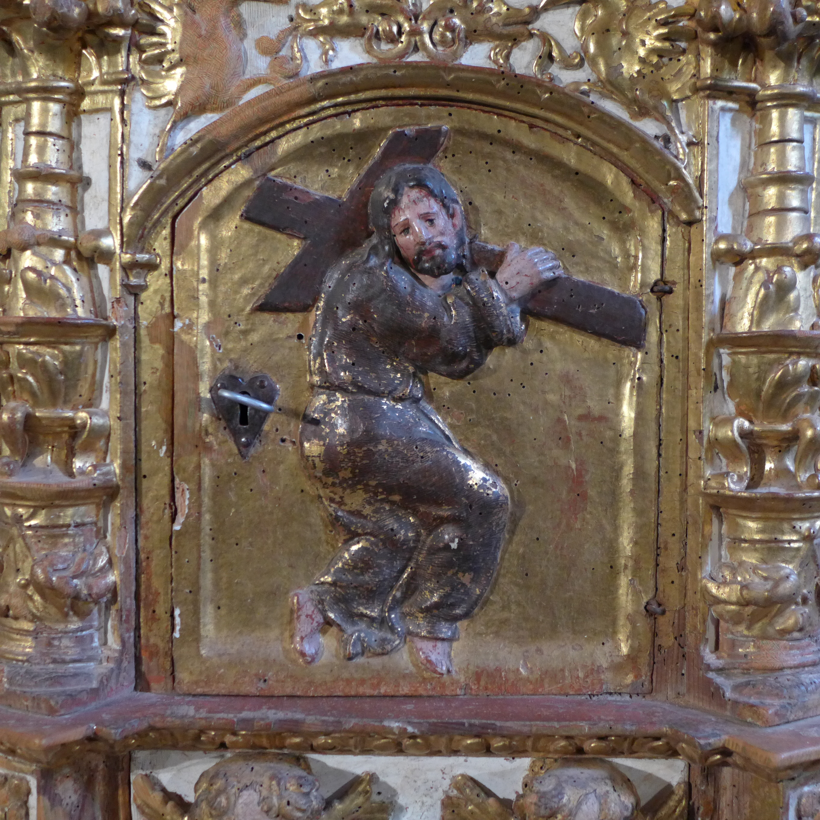En la cara exterior de la puerta del tabernáculo se talló un medio relieve que representa a Cristo con la cruz a cuestas, escena de carácter pasional que no es extraños encontrar en esta ubicación. Bien es cierto que la composición resultante es bastante curiosa sin ninguna referencia espacial y con Cristo en primer plano en actitud de caminar. El peso de la cruz y el espacio disponible le fuerzan a ir algo agachado, de ahí que parezca que va en cuclillas. Porta la cruz sobre el hombro izquierdo y gira su cabeza hacia los fieles, con gesto dolorido y conmovido. Viste túnica oscura, ceñida a la cintura, y que le llega hasta los pies sin apenas plegados.