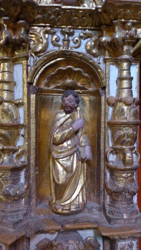 Figurita de San Pablo que habita una de las dos hornacinas del tabernáculo del retablo mayor. Aparece en pie, vestido con túnica y manto dorados, sujetando en su mano izquierda un libro cerrado y en la derecha empuñadura de la espada que normalmente identifica al santo. La figura se dispone en una postura elegante, torsionada, a lo contribuye las envolventes vestiduras de multiplicados pliegues que viste.