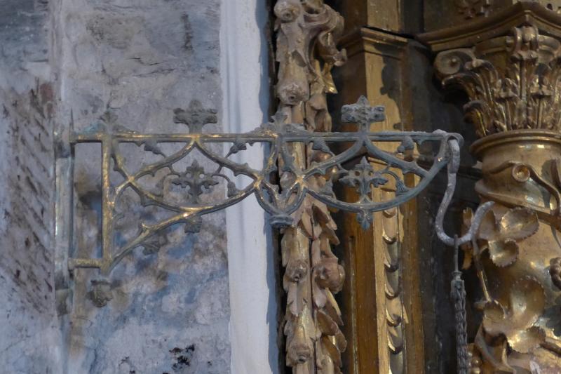 Pescante de obra de forja de estructura calada y escasa altura. Consiste en dos semicírculos con combados que los subdividen unidos por un elemento axial decorativo. Pequeñas hojitas de forja se inscriben en cada círculo, y remates a modo de cruces tachonan la pletina superior. Un gancho móvil en el extremo estrecho sostiene la lámpara.