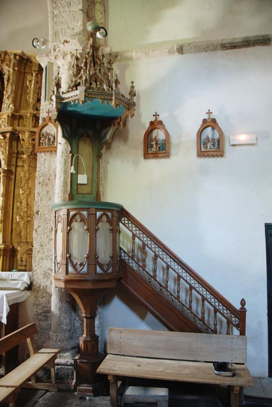 Púlpito compuesto de basa, pie, tribun, escalera de acceso y tornavoz. La basa consiste en dos piezas de madera de planta octogonal, escalonadas y molduradas. Sostiene un mínimo fuste octogonal también rematado cor un elemento polibonal invertido para servir de base a la tribuna, así mismo de ocho lados. Esta, circular, separa mediante pilastras estriadas una serie de aberturas verticales rematadas arriba y abajo por arcos ojivales que arrancan de bolas, policromados y dorados, si bien el tambor de la tribuna es opaco, y ciega los arcos.