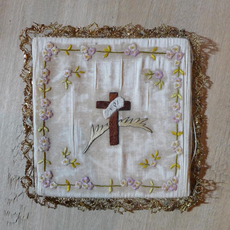 Corporal de formato cuadrado realizado en seda blanca y galón dorado. Una cenefa de flores y hojitas alternantes se bordó en su perímetro, junto a otras cuatro en las esquinas al interior, para enmarcan el motivo central, una cruz con el titulus (INRI) y una palma de martirio.