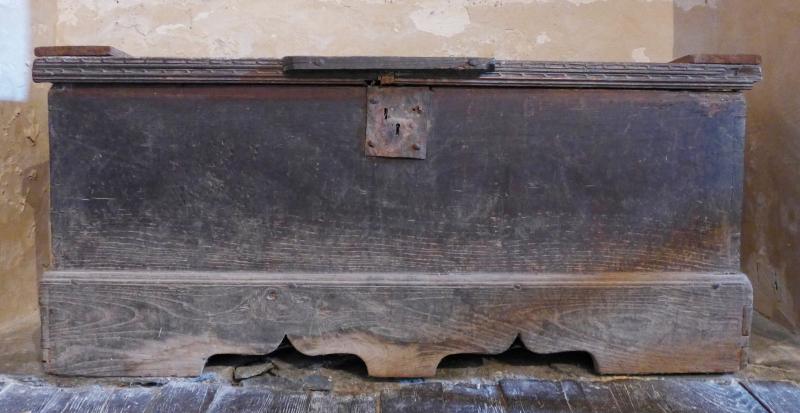 Caja de estructura prismática rectangular constituida por seis paneles enterizos, lisos todos. El arca se asienta directamente sobre un alto pie corrido, adornado en su frente con dos arcos conopiales. Dispone de una cerraja central, en desuso, en el panel frontal, que disponía de dos llaves.