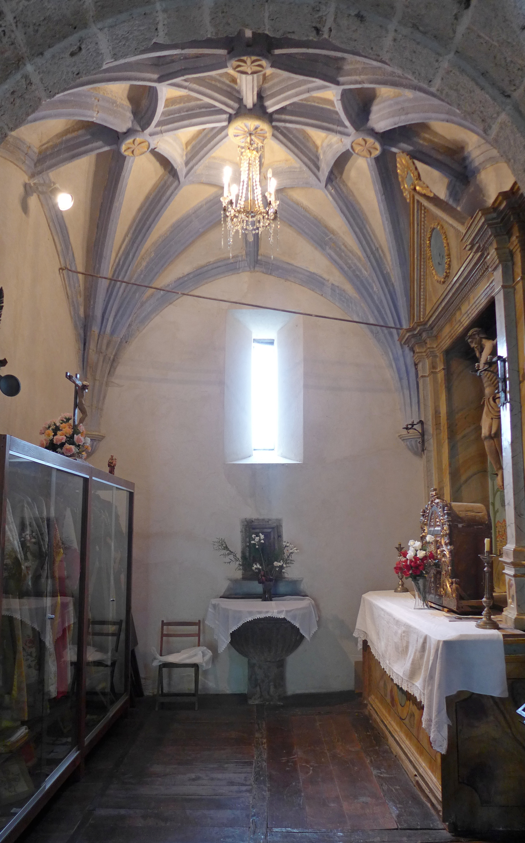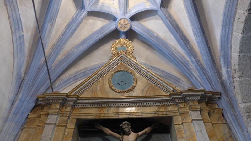 Retablo-hornacina (de remate recto), de un solo cuerpo y ático, pensado exclusivamente para exhibir el Cristo que lo preside. Se compone de mesa de altar y una sucinta arquitectura compuesta de dos medias pilastras (en dos planos crecientes hacia el fondo) rematadas por collarino y tres platabandas a modo de capitel. Esta planta quebrada se manifiesta en el entablamento, adornado con gotas. Dan lugar a un simple ático, de piñón triangular con un tondo pintado en su parte central con los tres clavos a modo de "arma Christi" adornado por una orla de talla. Una tarja remata el piñón y dos pináculos (en realidad planchas pintadas) se disponen encima de cada haz de medias pilastras.
