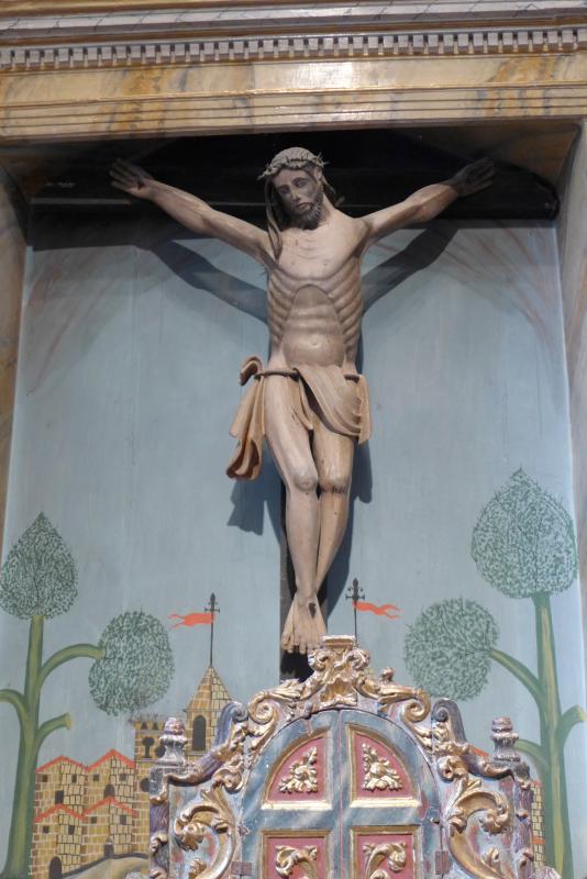 En el centro del retablo que ocupa el testero de la capilla de Santa Ana se dispone este crucificado, coetáneo al retablo. Es una imagen de discreta ejecución, con estudio anatómico muy elemental donde llama especialmente la atención el trabajo del torso. Brazos y piernas acentúan esa concepción fibrosa de la anatomía que concibió su autor. Porta un escueto paño de pureza que se sujeta por un cordón en la cadera derecha generando una serie de pliego concéntricos. El rostro muestra aspecto doloroso y la corona de espinas deja caer algún mechón de pelo hacia los hombros. La cruz sobre la que se clavó puede ser la origina, pero tiene el rotulus repintado.