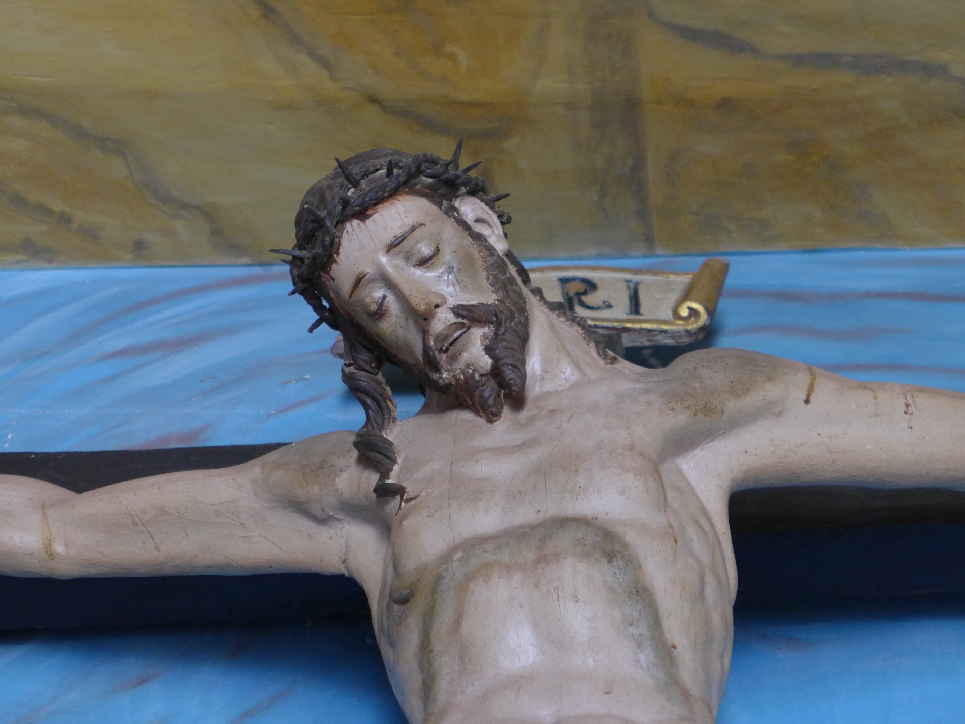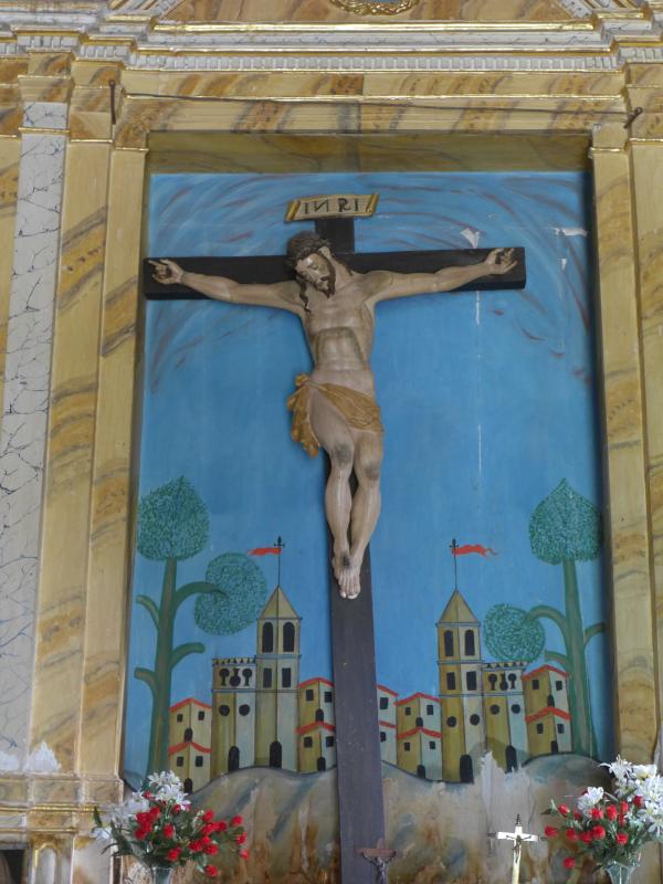 Cristo de tres clavos, cabeza ladeada a su derecha, boca entreabierta que refuerza el sentido de dolor y ojos cerrados, de correctas proporciones, que marca acusadamente la caja torácica. Porta un discreto paño de pureza con nudo a su derecha. Destaca sobre el fondo, agresivamente repintado.