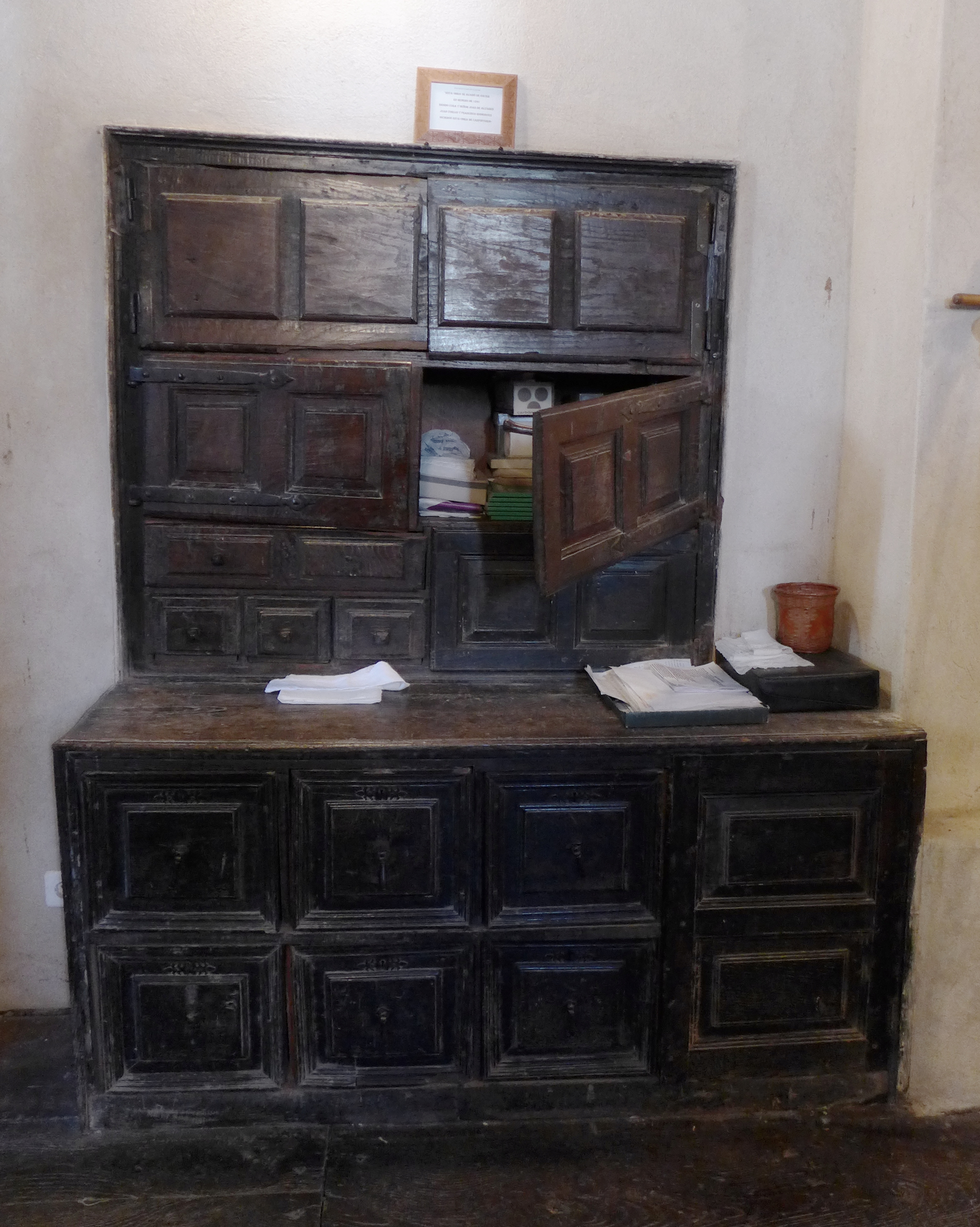 Mueble para guardar ornamentos y vestiduras litúrgicas. En este caso no responde al tipo más usual, sino que se complementa con un frontal ce carpintería que a la vez encubre un espacio accesario de honacina excavado en el muro.