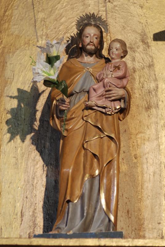 A pesar de tratarse de una escultura relativamente contemporánea encontramos cierto interés en ella por el aspecto de los rostros de San José y del Niño, lejos de los habituales tipos industrializados que suelen recoger la mayor parte de estas imágenes. No se han podido localizar los sellos de su procedencia, lo que aclararía mucho este atípico detalle. El patriarca va vestido con larga túnica grisáceo y manto marrón prendido en el pecho, mientras el Niño lleva una túnica rosa y sujeta una pequeña cruz dorada contra el pecho. San José luce barba corta y melena peinada al medio. Ambos rostros son dulces y serenos, de facciones escasamente marcadas, y con una característica caída de ojos.