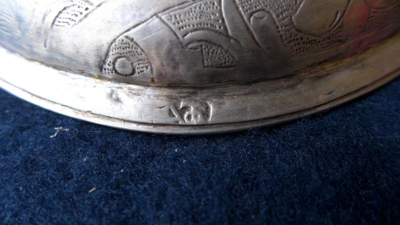 En la parte inferior de la base se aprecia un punzón frustro del que se llegan a leer estas cuatro letras unidas en dos: ANTO (las tres primeras se unen por sus vástagos y la última se inserta en la anterior)