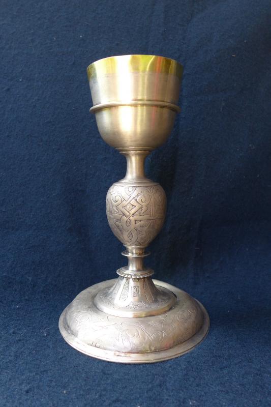 Peana circular de escasa altura compuesta por dos cuerpos y un saliente pestaña plana, el inferior convexo decorado con motivos de cintas o bandas decorativas grabadas. El cuerpo superior se proyecta en altura adquiriendo una forma troncocónica de perfil cóncavo, rematado por una arandela y con decoración del mismo tipo e igualmente sobre un fondo punteado. Astil flanqueado arriba y abajo por dos pequeños cuellos cilíndricos; el nudo de forma de jarrón repite la decoración del pie. Sobre éste va la copa de sección troncocónica, completamente lisa pero cortada en su centro por una moldura baquetonada.