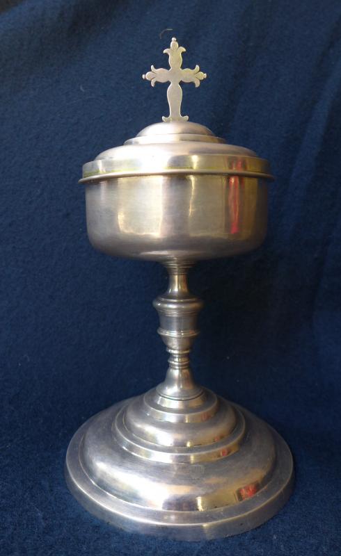 Base abullonada compuesta de diferentes molduras lisas y curvas de tamaño decreciente. Su astil, que parece de una cronología posterior, es torneado, con nudo semioval y cuellos troncocónicos arriba y abajo. La copa, cilíndrica, tiene pestaña superior para encajar la tapadera. Esta última, también abultada, aunque de escasa altura, se remata con una cruz lisa, recortadas, de travesaños flordelisados.