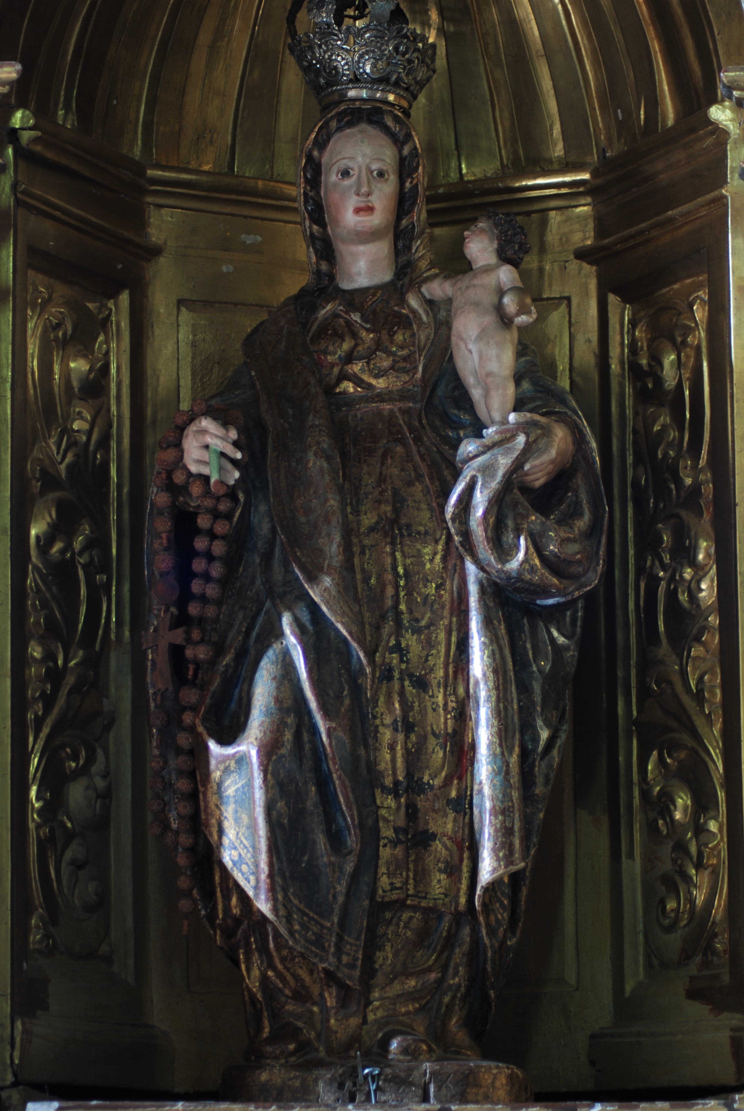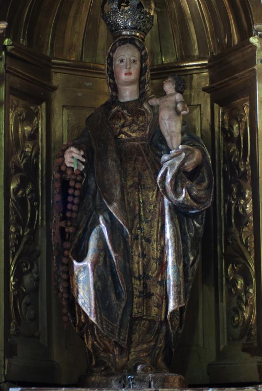 Imagen de bulto redondo de la Virgen con el Niño. Ambos, madre e hijo, aparecen en pie, aunque el infante dispuesto sobre el brazo izquierdo de María y desnudo. Por el contrario, ella viste larga túnica ceñida en la cintura, manto que cae desde los hombros y se recoge de manera efectista con la mano izquierda, y toca que le cubre parcialmente el cabello. Lo ampuloso de sus vestiduras hace que la talla describa un perfil ligeramente ahusado y que muestre un notable movimiento en su postura y actitud de avance. El rostro, enmarcado por los cabellos, adolece de cierta expresión, como suele ser habitual en la época pero muestra ciertos estilemas que recuerda a la plástica desplegada por Gregorio Español y sus seguidores en el entorno astorgano.