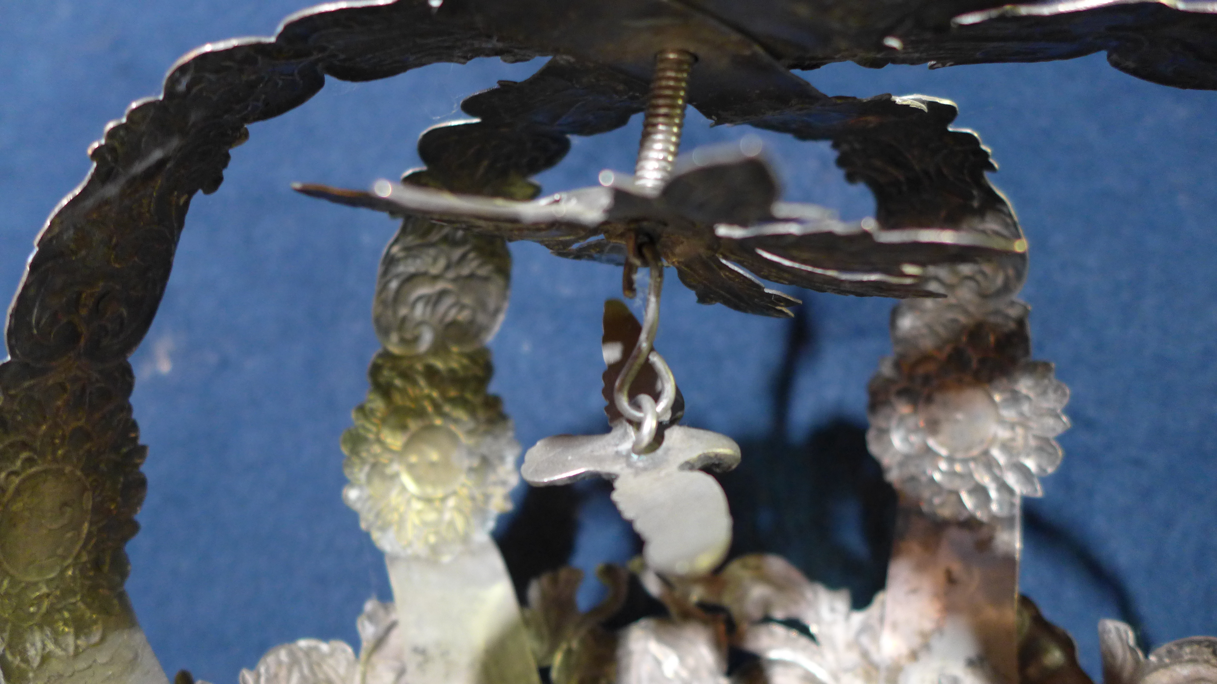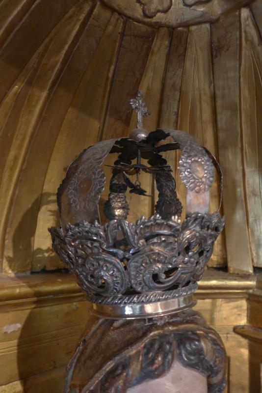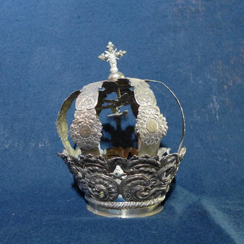 Corona de tipo real cerrada. Se compone de anillo liso con pestaña saliente y cuerpo que se inicia inferiormente en una moldura de soga. La cesta, toda calada, lleva decoración de ces, rocallas y motivos fitomorfos. Sobre ella se lanzan seis imperiales de distinta factura al resto del conjunto pero similares a los que lleva la corona de la Guianina, con florones, ces arriñonadas y otros exornos vegetales grabados sobre chapa de plata. Cierra el conjunto un orbe y sobre él una trabajada cruz de travesaños bulbosos. En el espacio resultante entre la cabeza de la talla y los imperiales se dispone un colgante con un florón y un ave, ambos de plancha de plata recortada y grabada.