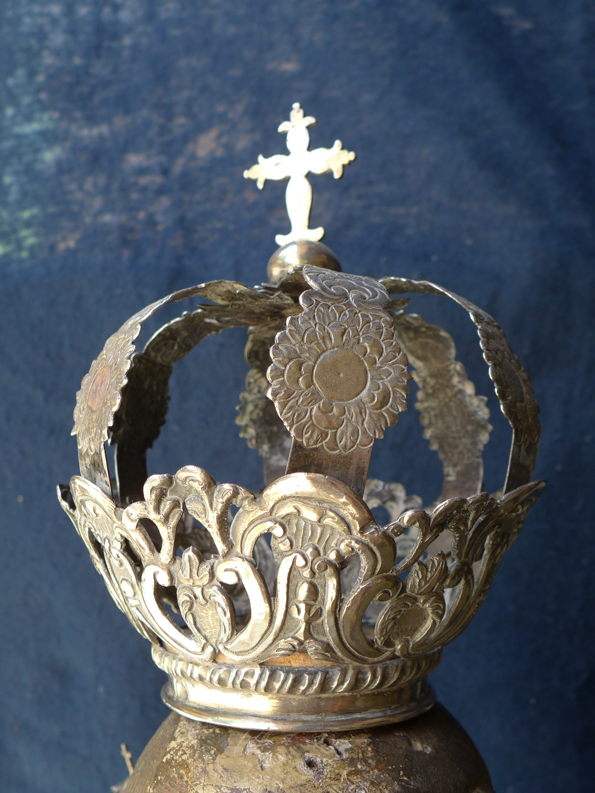 Corona de tipo real cerrada. Se compone de anillo liso con pestaña saliente y cuerpo que se inicia inferiormente en una moldura de soga. La cesta, toda calada, lleva decoración de ces, rocallas y motivos fitomorfos. Sobre ella se lanzan seis imperiales de distinta factura al resto del conjunto, quizá añadidos con posterioridad, o, desde luego, elaborados con un material distinto; también su decoración únicamente grabada es distinta. Cierra el conjunto un orbe y sobre él una cruz plana de travesaños bulbosos.