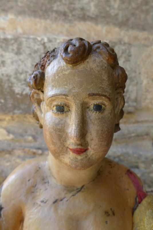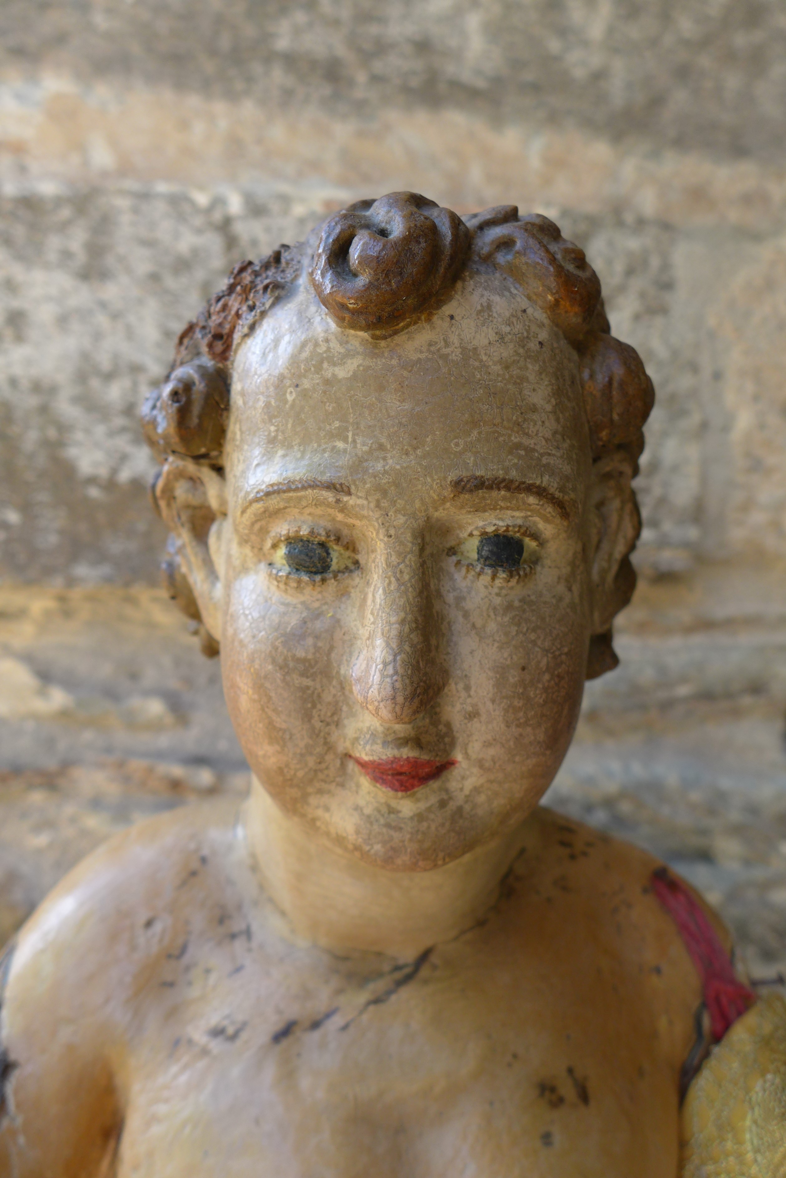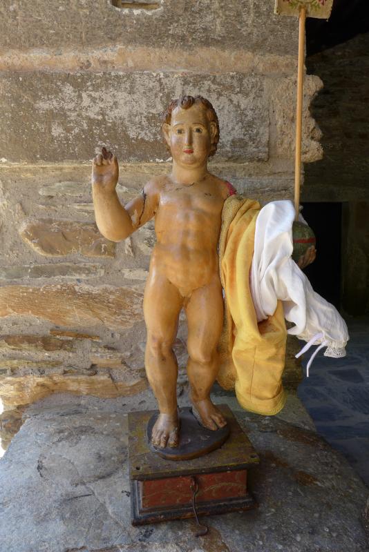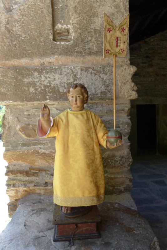 Talla de un Niño de pie, en posición de avance (los pies se alzan con piezas solidarias a ellos a distinta altura e inclinación), lo que da dinamismo a la talla, de correcta anatomía en tronco y piernas pero cuyos brazos desdicen un poco esas correctas proporciones. La cabeza, igualmente, parece excesivamente pequeña (al contrario que las orejas) e inexpresiva. Su corto cabello, compuesto de mechones acaracolados, dispone de discreta moñeta central.