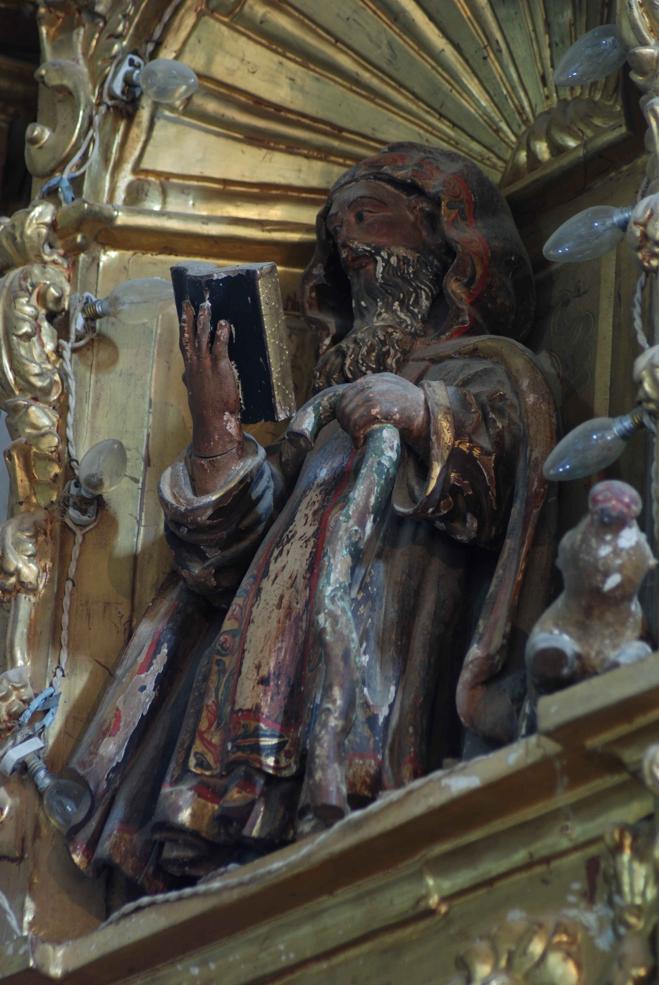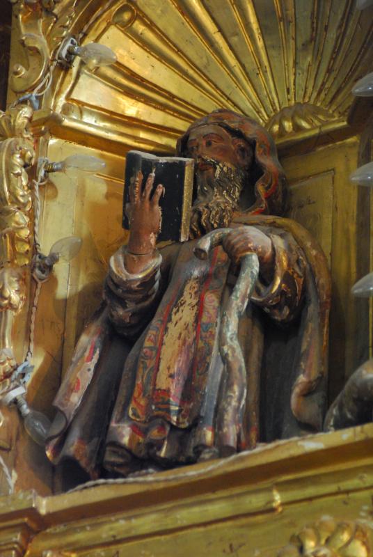 El santo anacoreta, de pie, se distingue por su concentrada lectura de un libro de cantos dorados, que sostiene con la mano izquierda muy cerca de su faz, y un enorme bastón "rústico", aserpentado, con el que se apoya.
