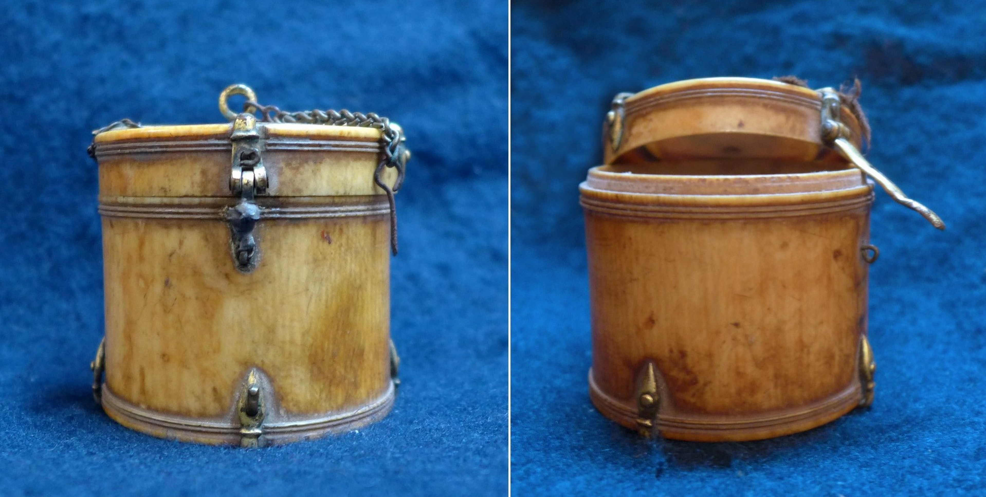 Caja cilíndrica de hueso que tiene por toda decoración parejas de cordones resaltados en la parte inferior y superior de la base y la superior de la tapadera. Para su cierre se proveyó de un interesante sistema de herrajes de cobre dorado. Para cerrarla, uno de estos remates conforma una pequeña falleba con bisagra, orificio para encajar en la argolla de cierre y pestaña saliente. Una vez ajustada, se insertaba un pasador metálico unido con una cadenita a la argolla que remata el conjunto.